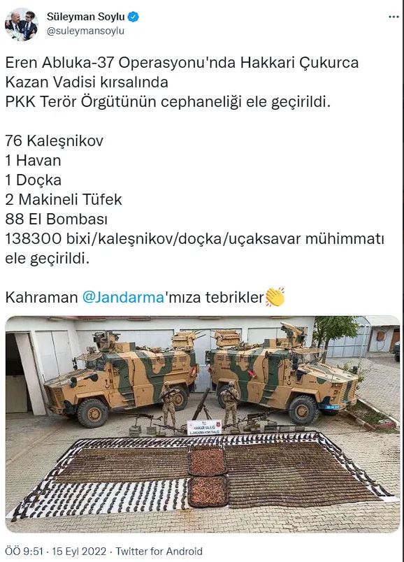 Bakan Soylu, operasyonla ilgili sosyal medya hesabından yaptığı paylaşımda, “Eren Abluka-37 Operasyonu'nda Hakkari Çukurca Kazan Vadisi kırsalında PKK terör örgütünün cephaneliği ele geçirildi. 76 Kaleşnikov, 1 havan, 1 doçka, 2 makineli tüfek, 88 el bombası, 138 bin 300 bixi/kaleşnikov/doçka/uçaksavar mühimmatı ele geçirildi. Kahraman jandarmamıza tebrikler” ifadelerini kullandı.-internethaber