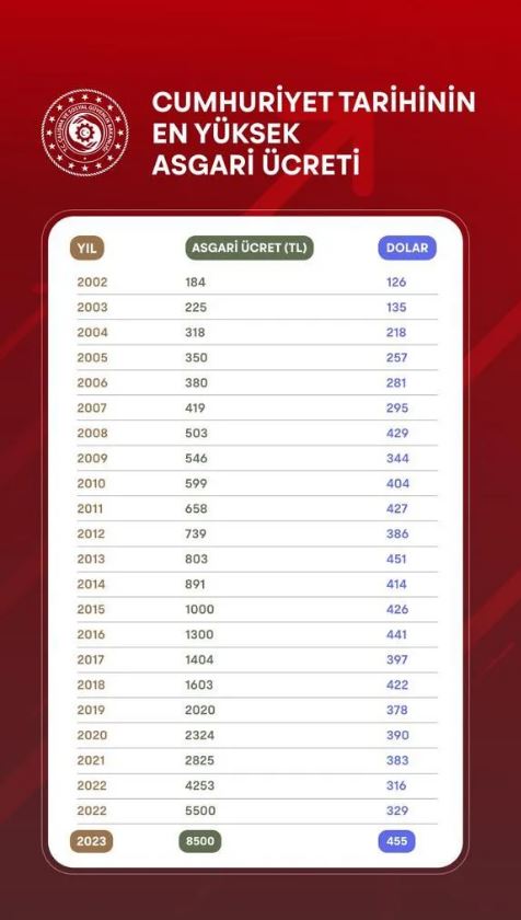 2023 asgari ücret 8 bin 500 lira oldu. Çalışma ve Sosyal Güvenlik Bakanı Vedat Bilgin, 2002 yılından bu yana uygulanan asgari ücret ve dolar karşılığının yer aldığı tabloyu paylaştı.