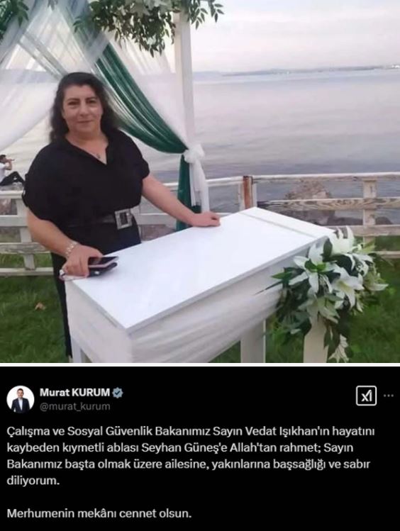 Bakan Murat Kurum, sosyal medya paylaşımında, “Çalışma ve Sosyal Güvenlik Bakanımız Sayın Vedat Işıkhan'ın hayatını kaybeden kıymetli ablası Seyhan Güneş’e Allah’tan rahmet; Sayın Bakanımız başta olmak üzere ailesine, yakınlarına başsağlığı ve sabır diliyorum. Merhumenin mekanı cennet olsun” ifadelerini kullandı.