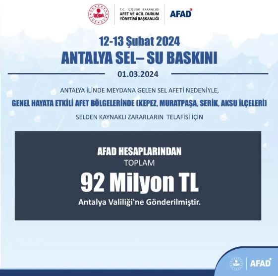 Genel Hayata Etkili Afet Bölgelerinde selden kaynaklı 505 işyeri ve 2.261 konut eşya zararının telafisi ile diğer acil ihtiyaçların karşılanması amacıyla AFAD tarafından Antalya Valiliğine 92 Milyon TL Acil Destek Ödemesi gönderildi.