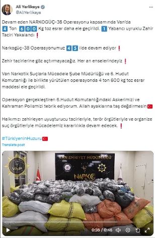İçişleri Bakanı Ali Yerlikaya, 45 ilde devam eden NARKOGÜÇ-38 operasyonuyla ilgili sosyal medya hesabından yaptığı paylaşımda, 4 ton 400 kilogram esrarın ele geçirildiğini ve 1 yabancı uyruklu şüphelinin yakalandığını ifade ederek, "Narkogüç-38 Operasyonumuz 45 ilde devam ediyor. Zehir tacirlerine göz açtırmayacağız. Her an enselerindeyiz. Van Narkotik Suçlarla Mücadele Şube Müdürlüğü ve 6. Hudut Komutanlığı ile birlikte yürütülen operasyonda 4 ton 600 kilogram toz esrar maddesi ele geçirildi. Operasyon gerçekleştiren 6.Hudut Komutanlığındaki Askerimizi ve Kahraman Polisimizi tebrik ediyorum. Allah ayaklarına taş değdirmesin. Halkımızı zehirleyen uyuşturucu tacirleriyle, terör örgütleriyle ve organize suç örgütleriyle mücadelemiz kararlılıkla devam edecek." ifadelerini kullandı.
