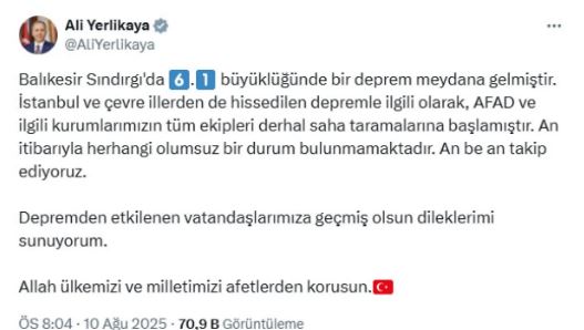 Deprem sonrası İçişleri Bakanı Ali Yerlikaya, sosyal medya hesabından açıklama yaparak Balıkesir halkına geçmiş olsun dileklerinde bulundu.