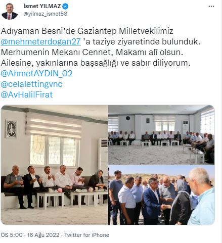 AK Parti Grup Başkanvekili ve Sivas Milletvekili İsmet Yılmaz Adıyaman Besni’de bulunan AK Parti Gaziantep Milletvekili Mehmet Erdoğan'a taziye ziyaretinde bulundu.