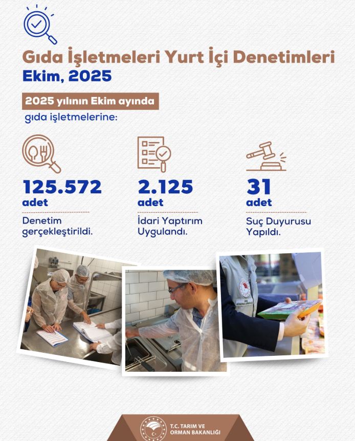“1–31 Ekim tarihleri arasında yurt genelinde toplam 125 bin 572 gıda denetimi gerçekleştirdik. Denetimler sonucunda uygunsuzluk tespit edilen 2 bin 125 işletmeye idari yaptırım uygulandı. Toplam 157 milyon 882 bin 731 TL tutarında idari para cezası kesildi. Ayrıca **31 işletme hakkında da suç duyurusunda bulunduk.”
