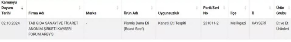 Dünya genelinde her gün milyonlarca insanın gittiği Arby's'in Kayseri'de bulunan bir şubesinde yapılan incelemelerde, müşterilere sunulan Roast Beef ürününde dana eti yerine kanatlı eti kullandığı tespit edildi.