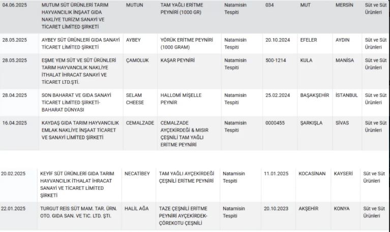 81 ilde yapılan kapsamlı denetimlerin ardından sahtecilik ve tağşiş yaptığı belirlenen firmalar kamuoyuyla paylaşıldı. Söz konusu peynir markalarının tamamında natamisin kullanıldığı belirlenerek ürünler ifşa edildi.
