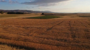Bu bir sirkülasyon. Bu bakterileri ise toprağa attıktan sonra faydalı olanı destekliyor, bu zeron buğdayı, arpa da olabilir. Bu ürüne öyle bir destek veriyor ki hızlı büyümesinden dolayı üre atmaya da gerek kalmıyor. Diğer ot az da olsa gölgesinde kaldığı için başını çıkaramıyor ve büyümeyi durduruyor. Bu tarla ithal tohum, dışardan gelmiş olan ve yıllardır Türkiye’de kullanılan bir tohum çeşidi. Burası da buğday, buraya ot ilacı kullandığını biliyorum, yine de ot çıkmış.