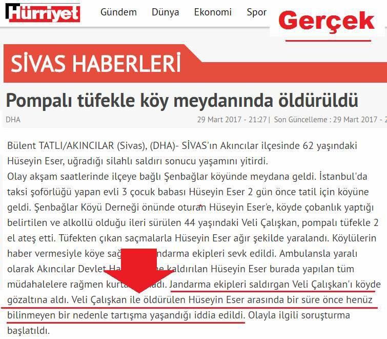 Hürriyet konuyla ilgili Pompalı Tüfekle Köy Meydanında Öldürüldü başlığını atarak “Jandarma ekipleri saldırgan Veli Çalışkan'ı köyde gözaltına aldı. Veli Çalışkan ile öldürülen Hüseyin Eser arasında bir süre önce henüz bilinmeyen bir nedenle tartışma yaşandığı iddia edildi.” İfadelerini kullandı.