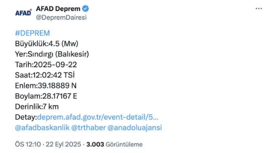Afet ve Acil Durum Yönetimi Başkanlığı’ndan (AFAD) alınan bilgiye göre, Balıkesir’in Sındırgı ilçesinde 4,5 büyüklüğünde deprem meydana geldi.