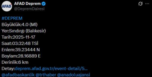 Afet ve Acil Durum Yönetimi Başkanlığı (AFAD), Balıkesir’in Sındırgı ilçesinde gece saatlerinde deprem meydana geldiğini duyurdu.