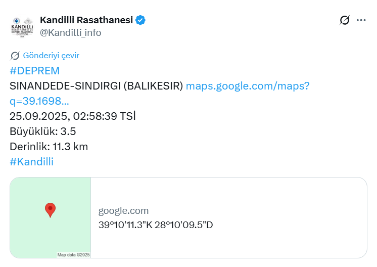 Kandilli Rasathanesi’nden yapılan açıklamaya göre, 25 Eylül 2025 tarihinde saat 02.58’de kaydedilen depremin büyüklüğü 3.5 olarak ölçüldü. Depremin yerin 11.3 kilometre derinliğinde gerçekleştiği bildirildi.