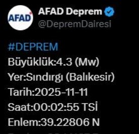 Afet ve Acil Durum Yönetimi Başkanlığı (AFAD), Balıkesir’de 4.3 büyüklüğünde bir deprem meydana geldiğini açıkladı.