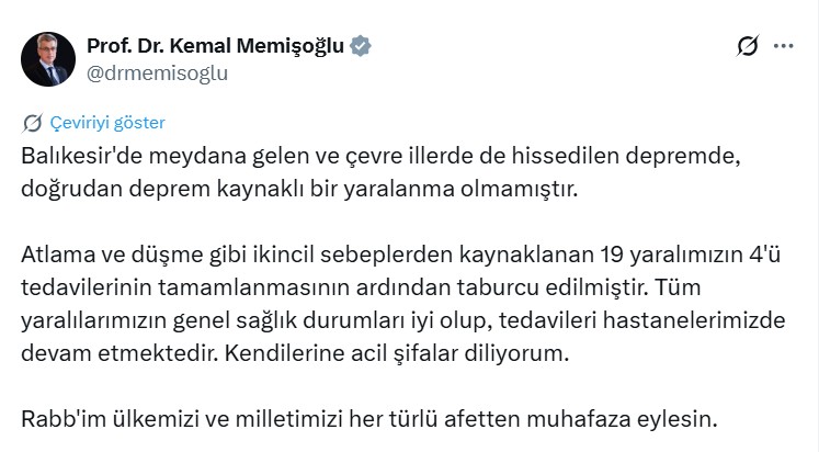 Sağlık Bakan Yardımcısı Prof. Dr. Kemal Memişoğlu, sosyal medya hesabından yaptığı açıklamada deprem nedeniyle doğrudan yaralanma olmadığını belirtti.
