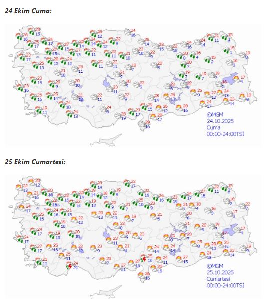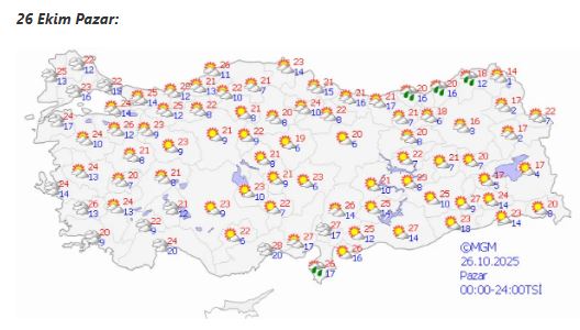 Doğu Akdeniz’de kuvvetli rüzgar ve fırtına beklenirken, sıcaklıklar iç ve kuzey kesimlerde hafif artacak, diğer bölgelerde mevsim normalleri civarında seyredecek. 25-26 Ekim tarihlerinde Güneydoğu’da yağışlar devam edecek, ay sonuna doğru Balkanlar’dan gelen Karambol sistemiyle birlikte sert soğuklar ve yüksek kesimlerde kar karışımlı yağışlar bekleniyor.