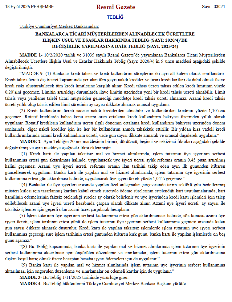 “Bankalarca Ticari Müşterilerden Alınabilecek Ücretlere İlişkin Usul ve Esaslar Hakkında Tebliğ”de değişiklik yapılmasına dair karar 18 Eylül 2025 tarihli sayıda yer aldı.