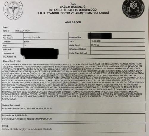 Fatih'te başıboş sokak köpeklerinin saldırısında hayatını kaybeden 40 yaşındaki Ayhan Özçelik'in hastane raporu yayınlandı.