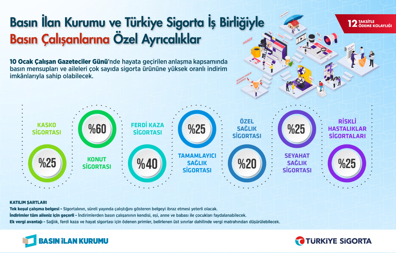 Yapılan iş birliği kapsamında, Basın İlan Kurumu’na akredite gazete, dergi ve internet haber sitelerinde çalışan basın mensupları ile birinci derece yakınlarının Türkiye Sigorta tarafından sunulan sigorta ürünlerinden indirimli olarak yararlanabileceği bildirildi. Söz konusu indirim oranlarının yüzde 20 ile yüzde 60 arasında değişeceği kaydedildi.