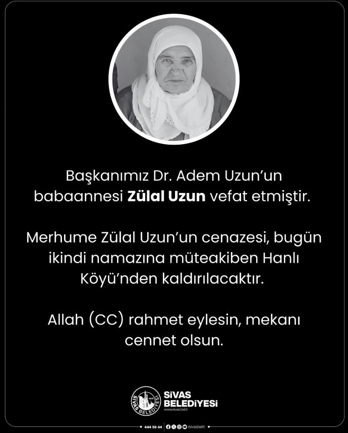 Sivas Belediye Başkanı Adem Uzun’un babaannesi Zülal Uzun hayatını kaybetti.