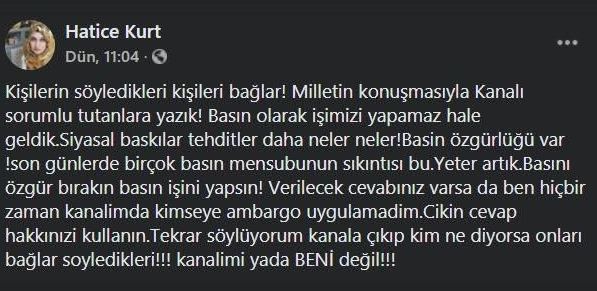 “Kişilerin söyledikleri kişileri bağlar! Milletin konuşmasıyla Kanalı sorumlu tutanlara yazık! Basın olarak işimizi yapamaz hale geldik. Siyasal baskılar tehditler daha neler neler! Basın özgürlüğü var! Son günlerde birçok basın mensubunun sıkıntısı bu. Yeter artık. Basını özgür bırakın basın işini yapsın! Verilecek cevabınız varsa da ben hiçbir zaman kanalımda kimseye ambargo uygulamadım. Çıkın cevap hakkınızı kullanın. Tekrar söylüyorum kanala çıkıp kim ne diyorsa onları bağlar söyledikleri!!! Kanalımı ya da BENİ değil!!!” diye serzenişte bulundu.”
