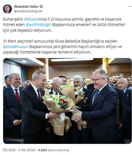 31 Mart seçimleri sonucunda Sivas Belediye Başkanlığına seçilen Adem Uzun Başkanımıza yeni görevinin hayırlı olmasını diliyor ve yapacağı hizmetlerde başarılar temenni ediyorum." ifadelerine yer verdi. (Emre Gençleşen)