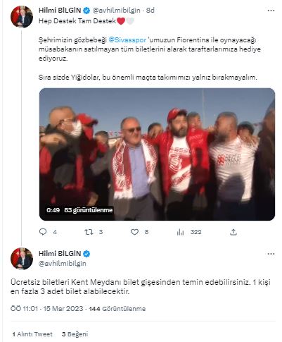 Sivas Belediye Başkanı Hilmi Bilgin Sivasspor'un yarın Fiorentina ile oynanacak Uefa Konferans Ligi maçında satılmayan biletleri satın aldıklarını duyurdu.