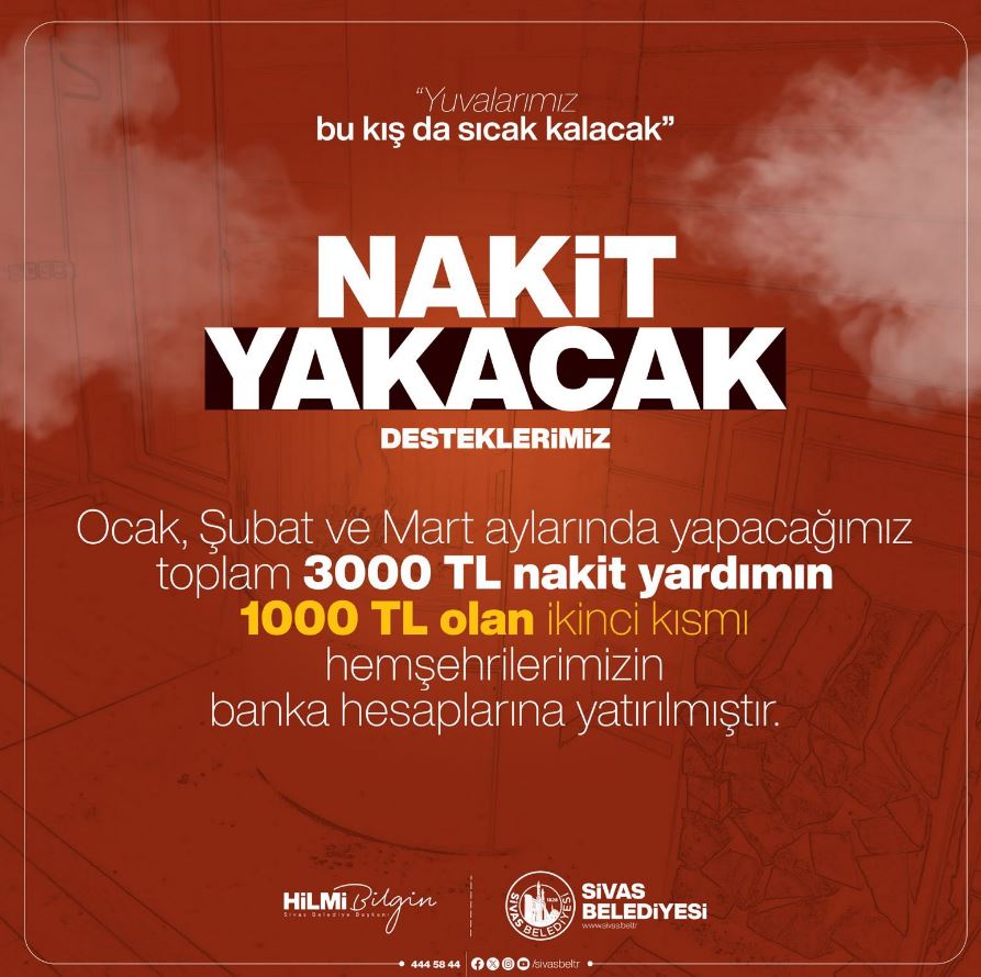 Başkan Bilgin paylaşımında: "Sosyal Belediyecilik anlayışıyla Ocak, Şubat ve Mart aylarında ihtiyaç sahibi hemşehrilerimiz için yapmış olduğumuz toplam 3000 TL nakit yakacak desteğinin 1000 TL olan ikinci ödemesi banka hesaplarına yatırılmıştır.