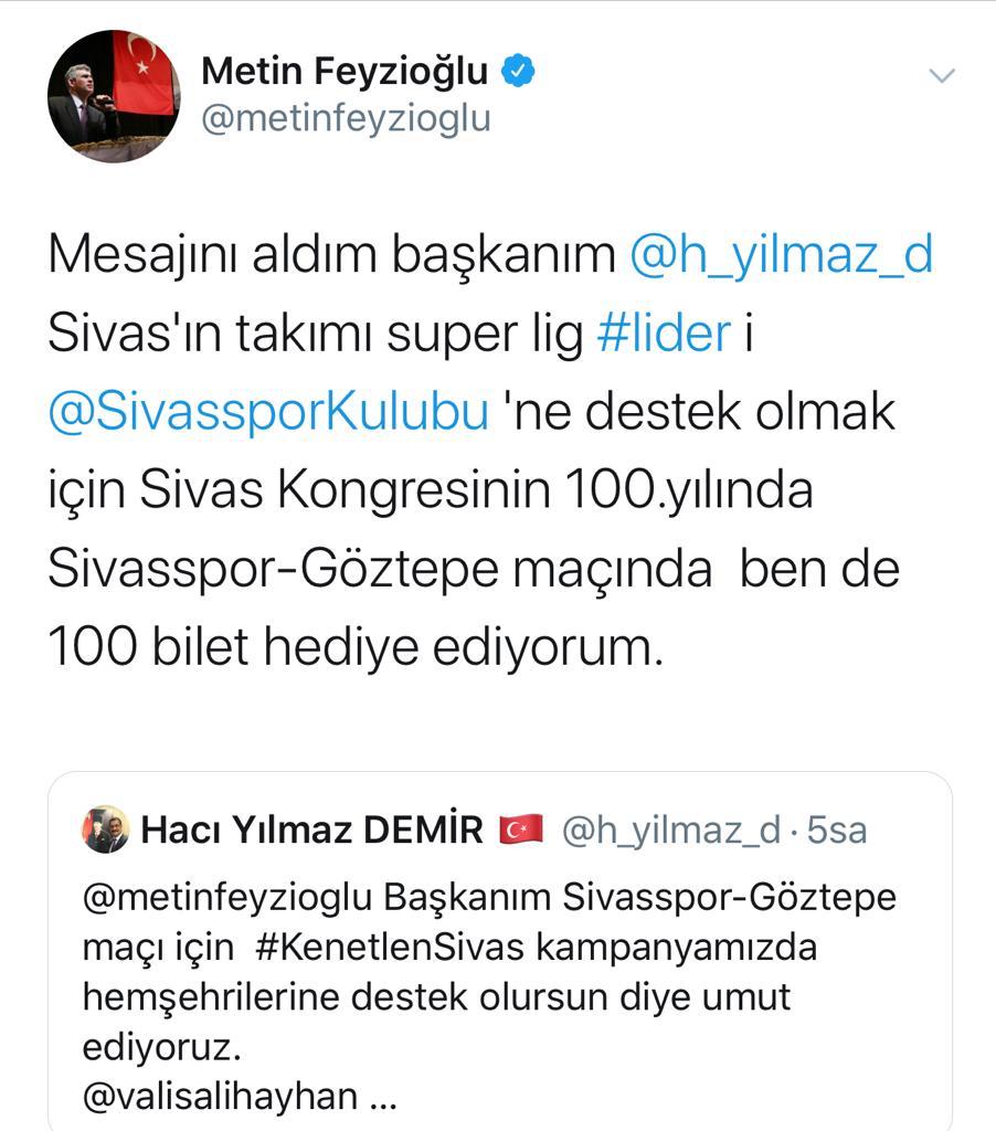 Sivas Baro Başkanı Hacı Yılmaz Demir'in sosyal medyadan, "Metin Feyzioğlu başkanım, Sivasspor-Göztepe maçı için kenetlen, Sivas kampanyamızda hemşehrilerine destek olursun diye umut ediyoruz." çağrısı üzerine Türkiye Barolar Birliği (TBB) Başkanı Metin Feyzioğlu da sosyal medya hesabından, "Mesajını aldım başkanım. Sivas'ın takımı, Süper Lig lideri Sivasspor'a destek olmak için Sivas Kongresi'nin 100. yılında Sivasspor-Göztepe maçında ben de 100 bilet hediye ediyorum." paylaşımında bulundu.