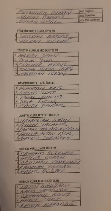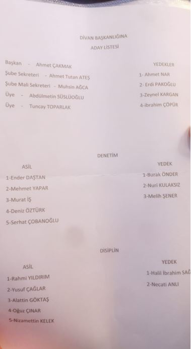 Mevcut Genel Sekreter Ahmet Çakmak'ın seçime girdiği liste şöyle;