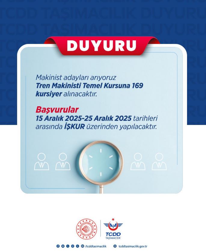 Başvurular Bugün Başladı.. TCDD Taşımacılık AŞ, Tren Makinisti Temel Kursu kapsamında 169 makinist adayı alımı yapılacağını duyurdu.