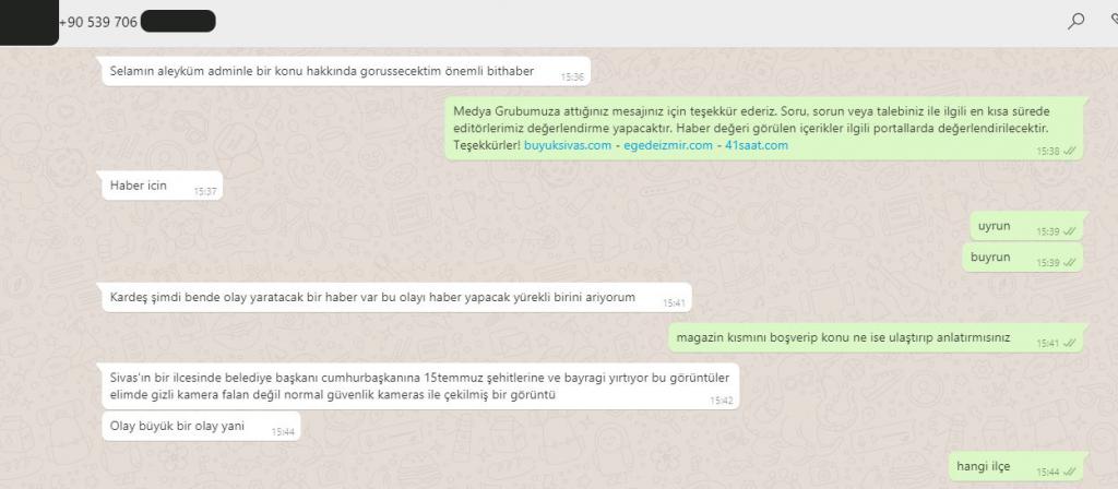 Vatandaş attığı mesajlarda Sivas'ta görev yapan bir Belediye Başkanının Cumhurbaşkanı ve 15 Temmuz Şehitlerine hakaret ettiğini ve Bayrağı yırttığını iddia ederek elinde görüntüler olduğunu belirtti.