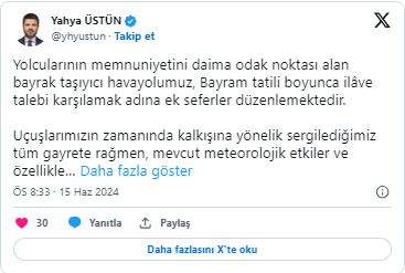 Türk Hava Yolları Basın Müşaviri Yahya Üstün, sosyal medya hesabından yaptığı açıklamada, uçuşların zamanında kalkışına yönelik büyük gayret sergilendiğinin altını çizdi.