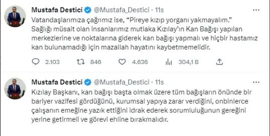 Sağlık durumu uygun olanların Kızılay merkezlerine giderek kan bağışı yapması gerektiğini söyleyen Destici, "Pireye kızıp yorgan yakmayalım." ifadesini kullandı. -internethaber