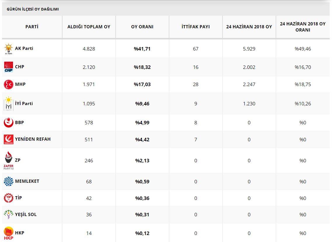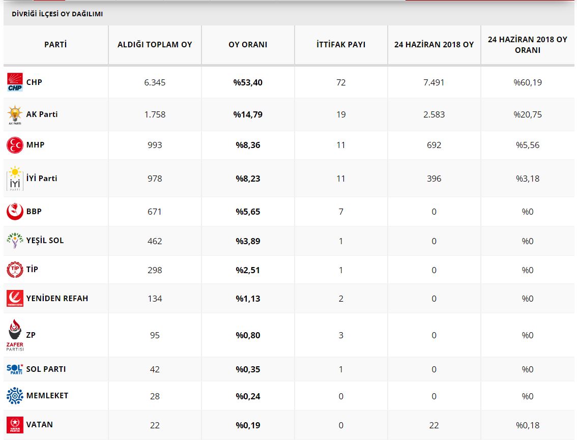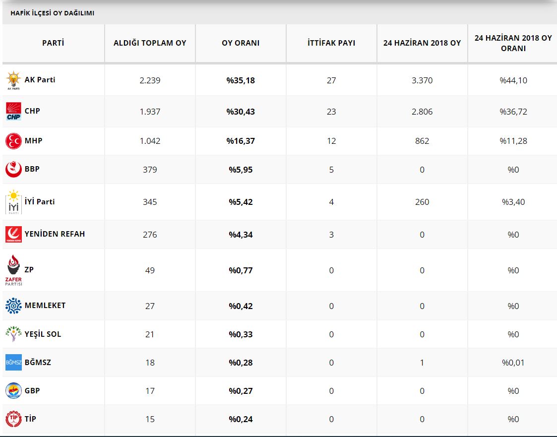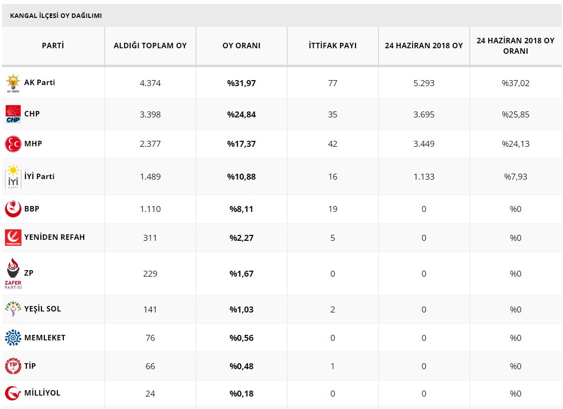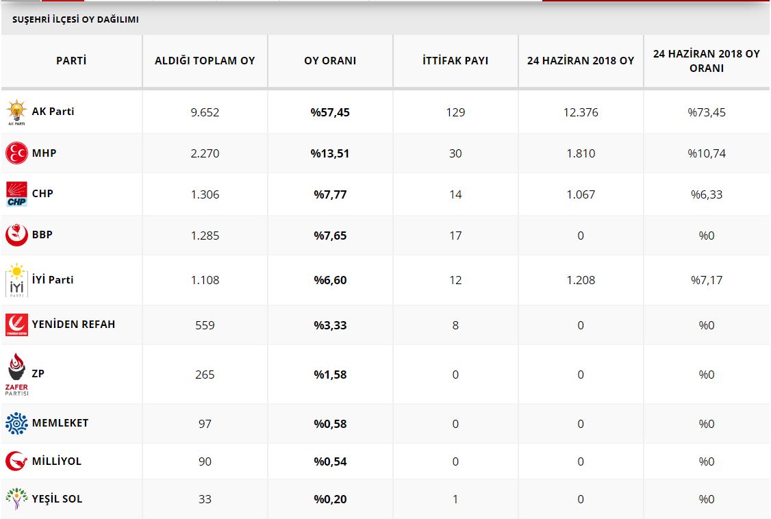 AK Parti, Sivas genelinde yaklaşık 167 bin oy alarak 24 Haziran 2018'deki son seçimlerde aldığı 223.500 oyun 56.500 oy gerisine düşmesine rağmen Sivas'ta yine birinci parti olmayı başardı... Merkez ilçede 100.000 bandının altına inen AK Parti, 99.300 oy alabildi.