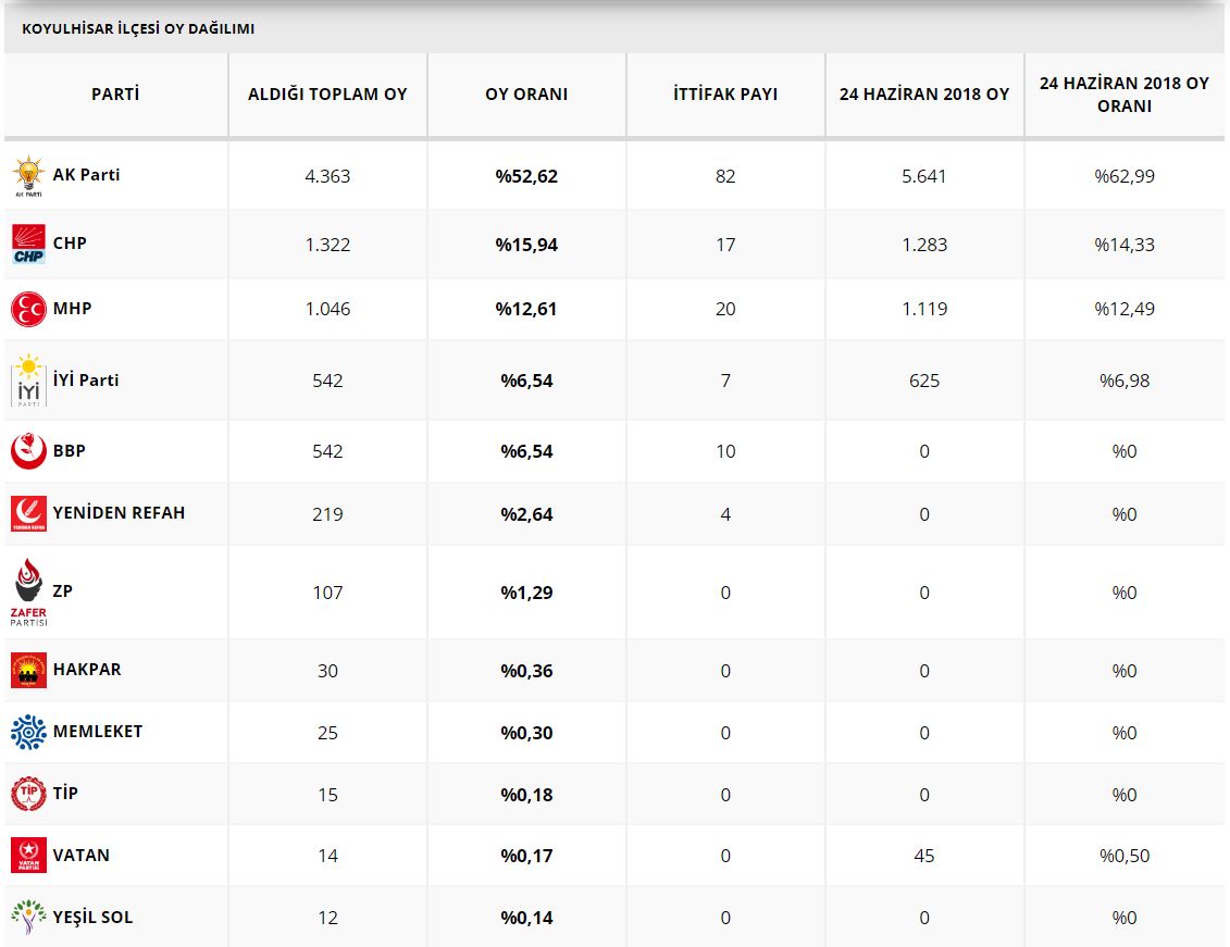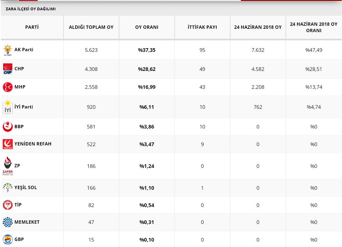 Aşağıdaki tabloda gösterildiği şekilde AK Parti Sivas'ta 2018 seçimlerine göre 56.000 oy kaybetmiş olmasına rağmen mevcut vekil sayısı 3'ü koruyabildi.