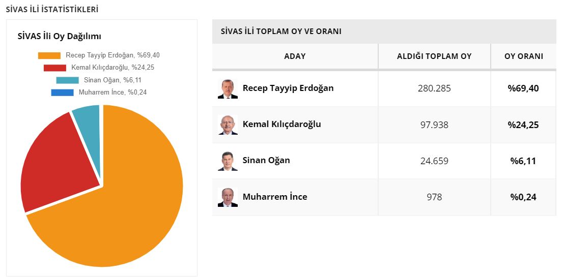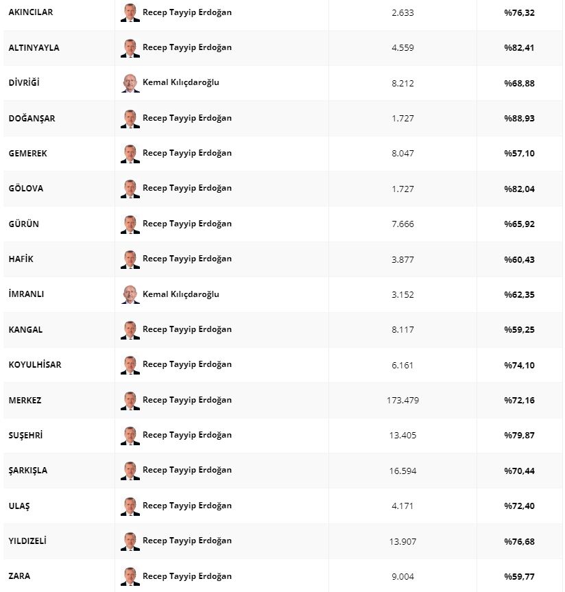 Mevcut sonuçlara göre Cumhurbaşkanı Erdoğan'a Sivaslılardan % 69,40'lık bir destek geldi... Erdoğan'a en büyük desteği her seçimde olduğu gibi Doğanşar (% 89) ilçesi verirken en az destek ise yine Divriği'den geldi...