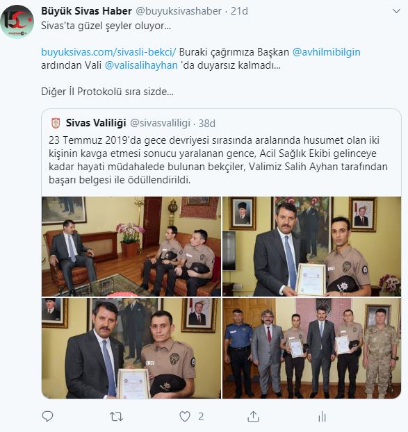 "23 Temmuz 2019'da gece devriyesi sırasında aralarında husumet olan iki kişinin kavga etmesi sonucu yaralanan gence, Acil Sağlık Ekibi gelinceye kadar hayati müdahalede bulunan bekçiler, Valimiz Salih Ayhan tarafından başarı belgesi ile ödüllendirildi." mesajıyla yapılan paylaşıma çok sayıda takipçi beğeni bıraktı.
