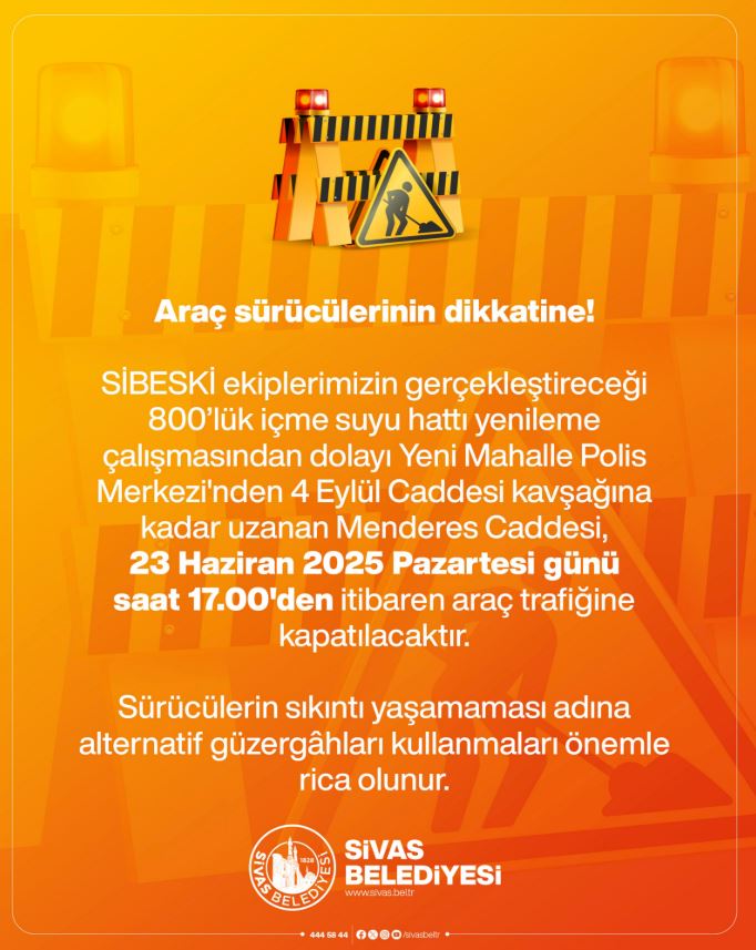 Sivas Belediyesi, şehir merkezinde gerçekleştirilecek içme suyu hattı yenileme çalışması nedeniyle Menderes Caddesi’nin 23 Haziran 2025 Pazartesi günü saat 17.00’den itibaren araç trafiğine kapatılacağını duyurdu.