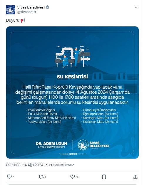 Sivas Belediye Başkanlığı sosyal medya hesabından su kesintisi ile açıklamada bulundu.