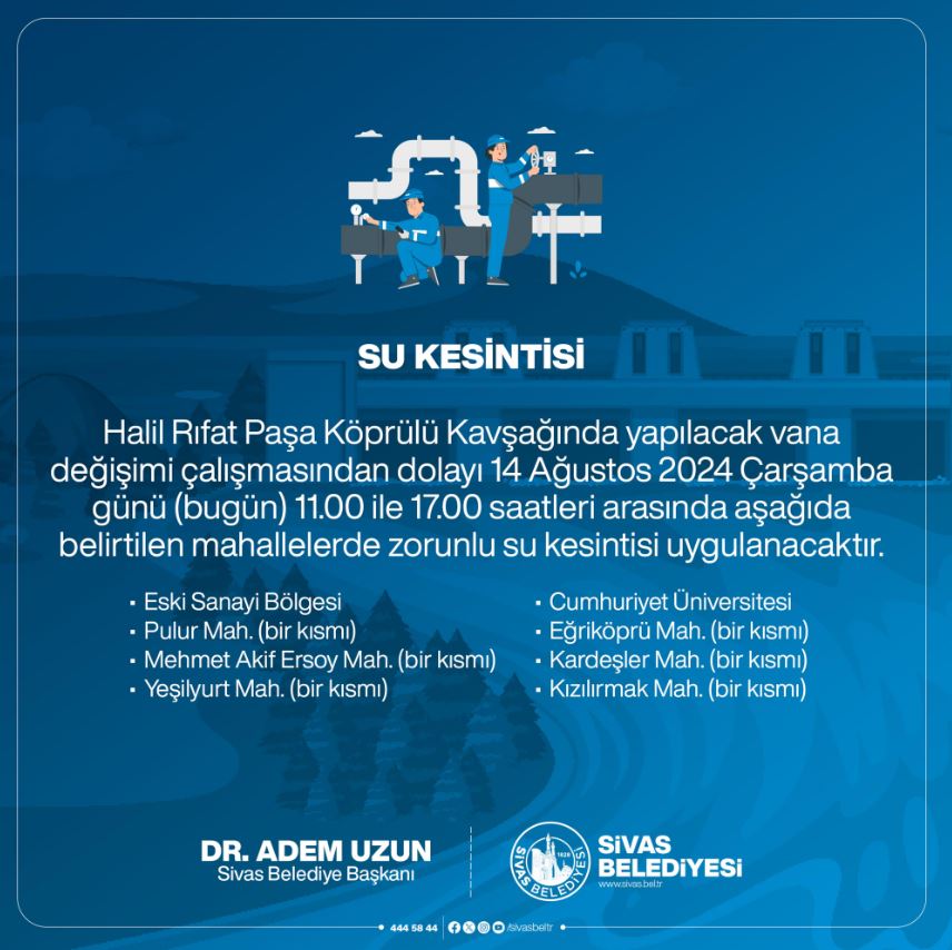 Sivas Belediye Başkanlığı saat 11:00'de kesilecek suyu ise 11:08'de açıkladı. Vatandaşlar kesintiye karşı herhangi bir önlem alamadı.