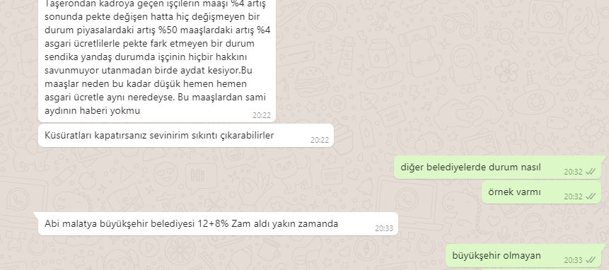 İşçilerin gönderdiği mesajda "Taşerondan kadroya geçen işçilerin maaşı %4 artış sonunda pekte değişen hatta hiç değişmeyen bir durum piyasalardaki artış %50 maaşlardaki artış %4 asgari ücretlilerle pekte fark etmeyen bir durum sendika yandaş durumda işçinin hiçbir hakkını savunmuyor utanmadan birde aidat kesiyor.Bu maaşlar neden bu kadar düşük hemen hemen asgari ücretle aynı neredeyse. Bu maaşlardan sami aydının haberi yokmu" ifadelerine yer verilirken birçok belediyede %30 civarında verilen zammın burada neden verilmediği sorgulanıyor.