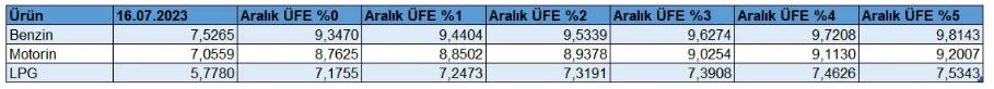 "Aralık 2023 dönemi aylık Yİ-ÜFE oranı yüzde '0' bile gelse bir litre benzin için pompaya yansıyacak ÖTV+KDV zammı 2 lira 18 kuruş olacaktır. Eğer Yİ-ÜFE yüzde 5 gelirse bu kez pompaya yansıyacak ÖTV+KDV vergi zammı 2 lira 75 kuruş olacaktır."