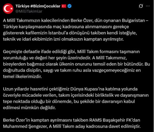 “Berke Özer, Bulgaristan – Türkiye karşılaşmasında maç kadrosuna alınmamasını gerekçe göstererek kafilemizin İstanbul’a dönüşünü takiben kendi isteğiyle, teknik ve idari ekibimizin izni olmaksızın kamptan ayrılmıştır. Milli takım formasını taşımanın sorumluluğu her şeyin üzerindedir. Disiplin, saygı ve takım ruhu asla vazgeçilemeyecek en temel ilkelerimizdir. Bu şekilde bir davranışın kabul edilmesi mümkün değildir.”