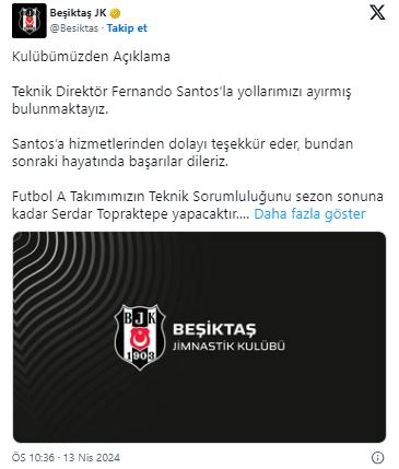 Beşiktaş, Samsunspor ile 1-1 berabere kaldığı maçın ardından teknik direktör Fernando Santos ile yollarını ayırdı.