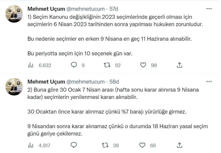 Erkene alınmış seçim ya da baskın seçim tartışmaları sürerken, Cumhurbaşkanı Başdanışmanı ve Cumhurbaşkanlığı Hukuk Politikaları Kurulu Başkanvekili Mehmet Uçum'dan seçim tarihiyle ilgili dikkat çeken bir açıklama geldi. Başdanışman Uçum, Twitter'dan yaptığı açıklamada, "Seçim Kanunu değişikliğinin 2023 seçimlerinde geçerli olması için seçimlerin 6 Nisan 2023 tarihinden sonra yapılması hukuken zorunludur. Bu nedenle seçimler en erken 9 Nisan'a en geç 11 Haziran'a alınabilir. Bu periyotta seçim için 10 seçenek gün var" ifadelerini kullandı. İşte Uçum'un seçim tarihiyle ilgili paylaşımları...