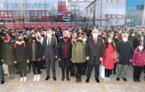 Okul bahçesinde düzenlenen bayrak törenine katılarak öğrencilerle birlikte İstiklal Marşı'nı okuyan Bilgin ve Aslan, daha sonra okulda görev yapan öğretmenlerle bir araya gelerek sohbet etti.