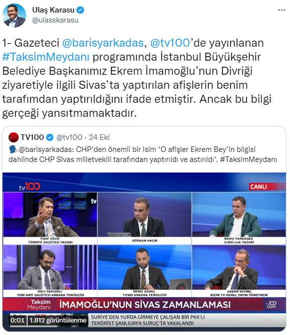 "Gazeteci @barisyarkadas, @tv100 ’de yayınlanan #TaksimMeydanı programında İstanbul Büyükşehir Belediye Başkanımız Ekrem İmamoğlu’nun Divriği ziyaretiyle ilgili Sivas’ta yaptırılan afişlerin benim tarafımdan yaptırıldığını ifade etmiştir. Ancak bu bilgi gerçeği yansıtmamaktadır.
