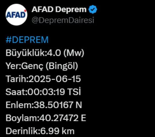 AFAD'ın verilerine göre, merkez üssü Genç ilçesi olan depremin büyüklüğü 4.0 olarak ölçüldü.
