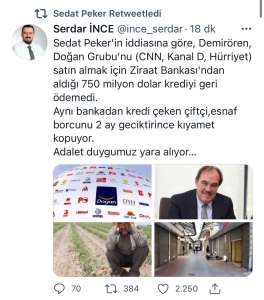İnce mesajında “Sedat Peker'in iddiasına göre, Demirören, Doğan Grubu’nu (CNN, Kanal D, Hürriyet) satın almak için Ziraat Bankası'ndan aldığı 750 milyon dolar krediyi geri ödemedi.