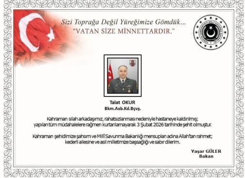 MSB’den yapılan bilgilendirmede, Bakım Astsubay Kıdemli Başçavuş Talat Okur’un 3 Şubat tarihinde şehit olduğu ifade edildi. Acı haberin ardından Bakanlık tarafından yayımlanan taziye mesajında, şehidimize Allah’tan rahmet; kederli ailesine, yakınlarına, silah arkadaşlarına ve Türk Silahlı Kuvvetleri camiasına başsağlığı dilekleri iletildi.