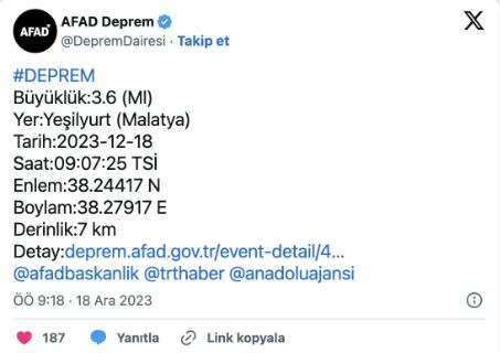 AFAD, sosyal medya hesabından Malatya'da deprem meydana geldiğini duyurdu.